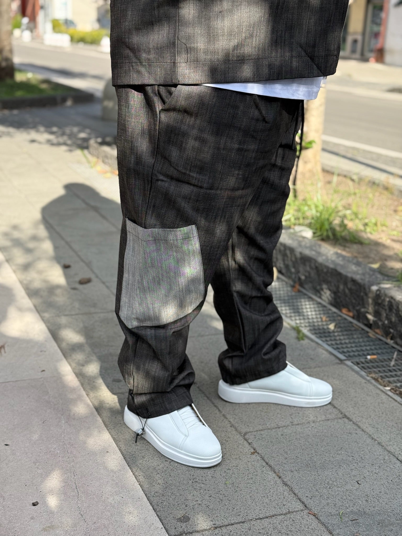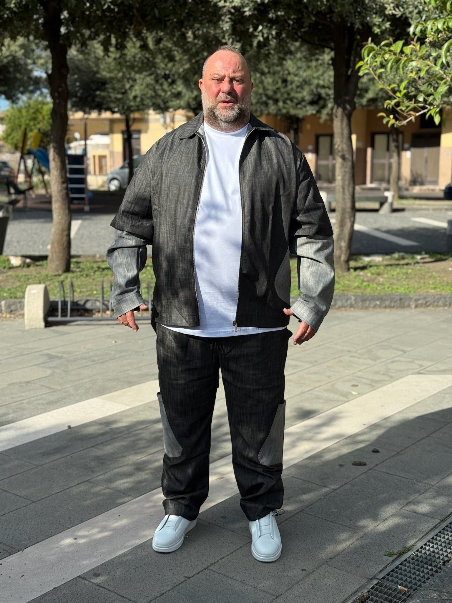giacca con chiusura con zip e pantalone fondo ampio con possibilità di stringerlo